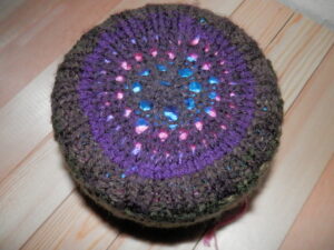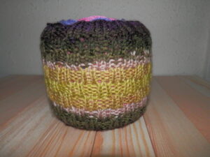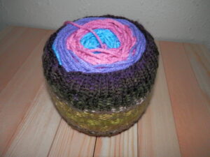 I had the idea to knit a yarn cozy for some of the larger size yarn cakes that are 140-200 grams of 3 weight and 4 weight yarn. What I came up with is what I’m calling My Big Cake Basket. It’s knit with 3 weight yarn and US 6 needles. This is knit in the round and has a basket weave body. Where you see sl2wyib you will slip 2 stitches purlwise with yarn in back. I haven’t tried this yet but I’m guessing you could also knit this in 4 weight yarn and US 8 needles and get maybe a little bit bigger yarn cozy that will still be able to hold this big yarn cakes. For this My Big Cake Basket I used some Premier Yarns Colorfusion DK in the color Grape Vine.
